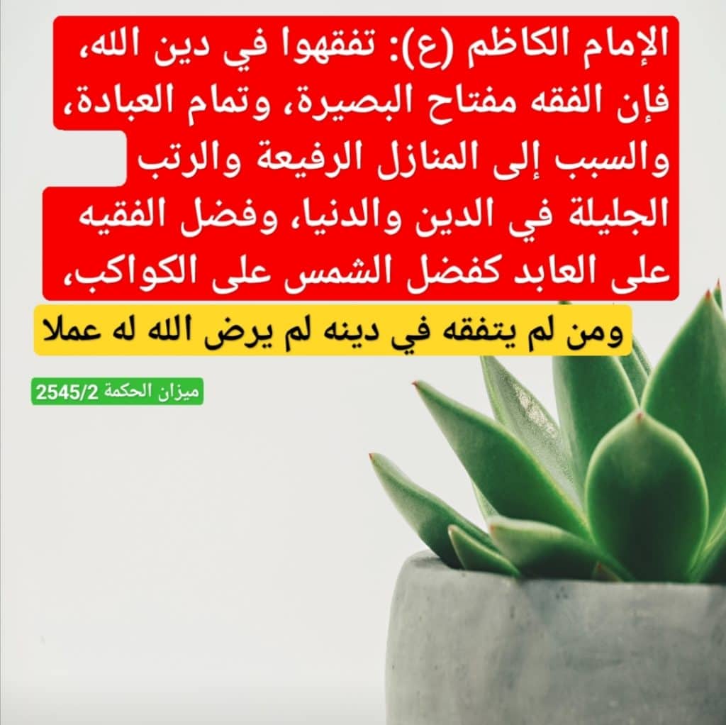الإمام الكاظم (ع): تفقهوا في دين الله، فإن الفقه مفتاح البصيرة، وتمام العبادة، والسبب إلى المنازل الرفيعة والرتب الجليلة في الدين والدنيا، وفضل الفقيه على العابد كفضل الشمس على الكواكب،