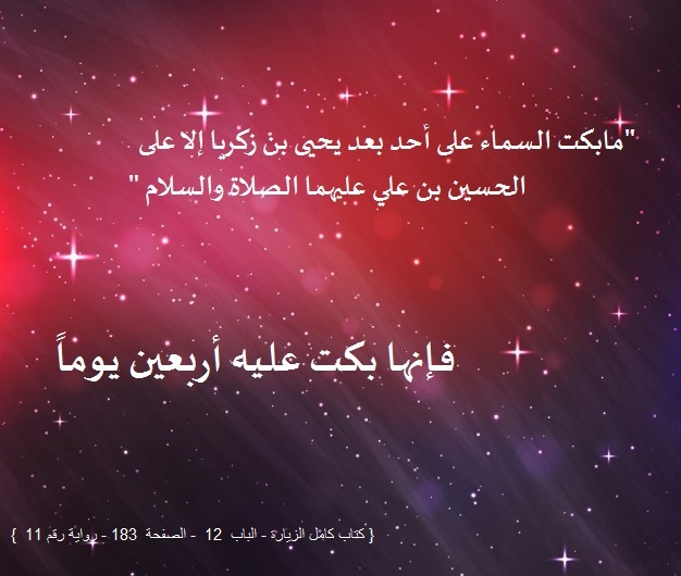 حدثني علي بن الحسين بن موسى ، عن علي ابن إبراهيم وسعد بن عبد الله جميعاً ، عن إبراهيم بن هاشم ، عن علي بن فضال ، عن أبي جميلة ، عن جابر ، عن الامام أبي جعفر عليه الصلاة والسلام قال : مابكت السماء على أحد بعد يحيى بن زكريا إلا على الحسين بن علي عليهما الصلاة والسلام ، فإنها بكت عليه أربعين يوماً