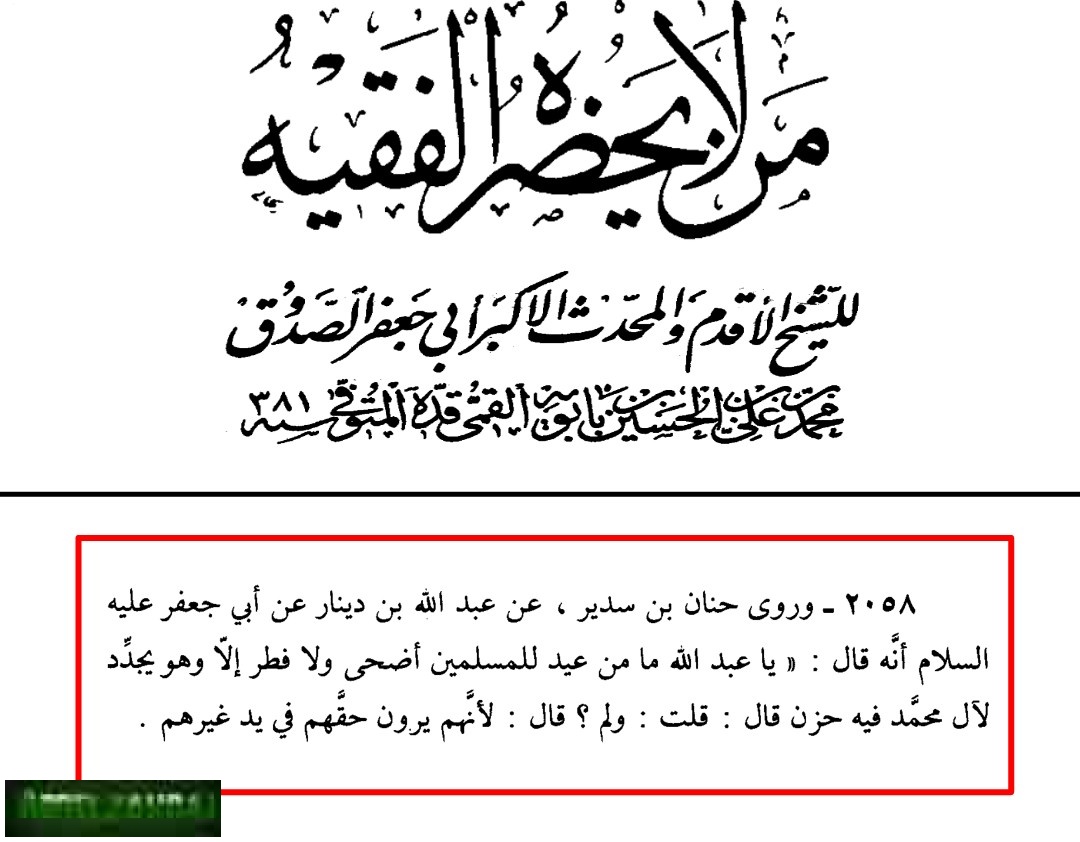 روى شيخ المشايخ الصدوق بسنده عن عبد الله بن دينار عن أبي جعفر الامام الباقر ( عليه الصلاة و السلام ) انه قال : يا عبد الله ما من عيد للمسلمين أضحى و لا فطر إلا وهو يجدد حزن لآل محمد فيه حزن قال : قلت : ولم ؟ قال : لأنهم يرون حقهم في يد غيرهم .