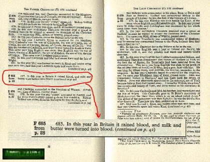يذكر المؤرخ البريطاني لكل سنة أحداثها حتى يأتي على ذكر أحداث سنة 685 ميلادية وهي تقابل سنة 61 هجرية وهي سنة شهادةٌ الإمام ابي عبد الله الحسين عليه السلام، فيذكر المؤلف أن في هذه السنة مطرت السماء دماً وأصبح الناس في بريطانيا فوجدوا أن ألبانهم وأزبادهم تحولت الى دم. راجع ذلك في الصفحة 38 من الكتاب. صور من الصفحة المقصودة مدرجة ادناه.